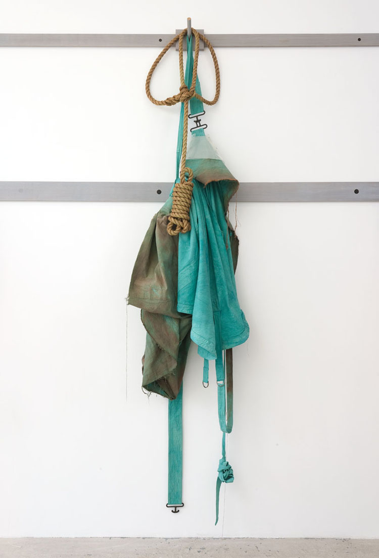 Cluster (Commensurate with Modern Progress) 2012, Existing sculptural component (2010), dyed canvas, sea salt, hardware, manila rope, plastic E-collar, on cedar peg and molding. 125 x 28 x 15 inches