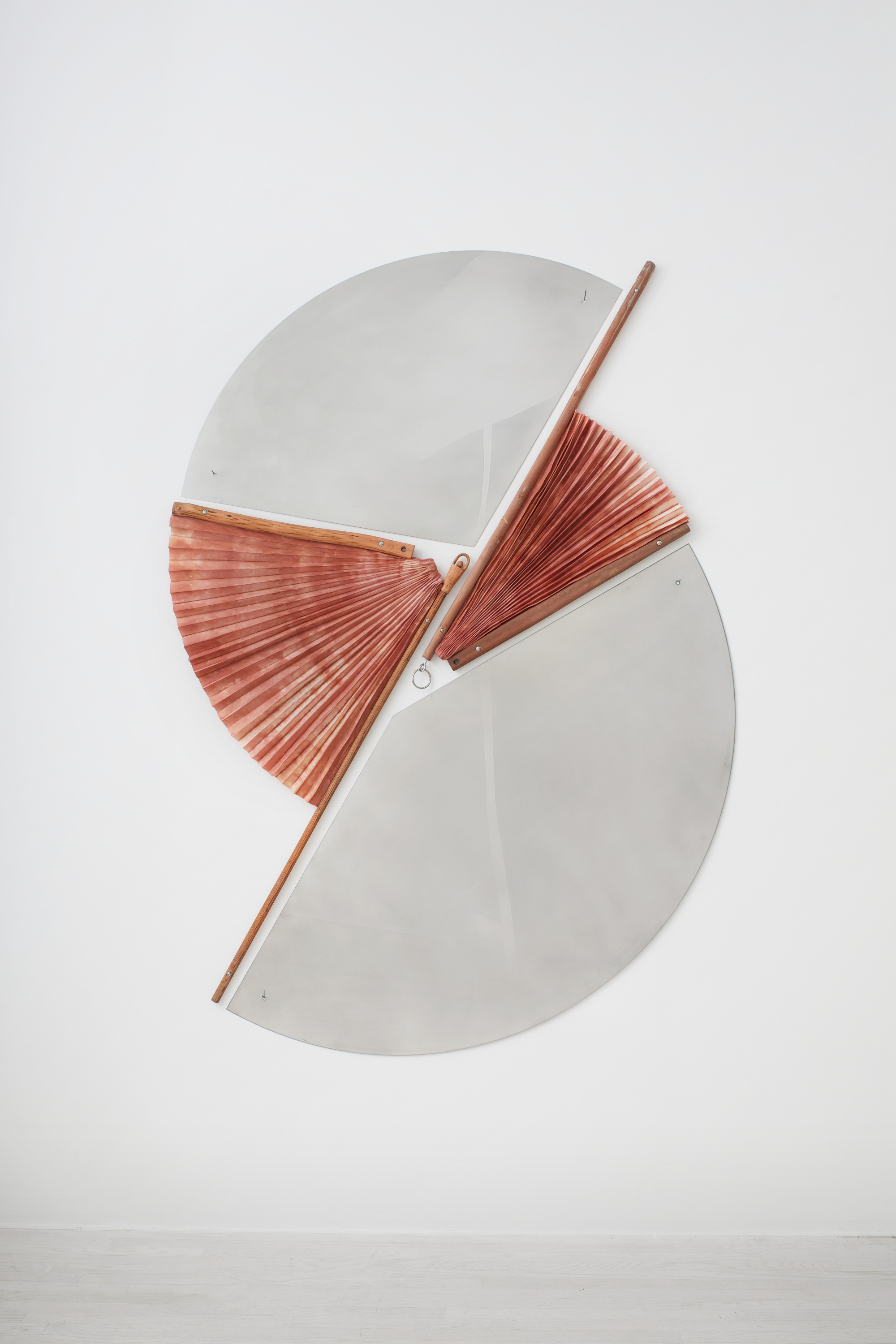 Cruel Radiance (Flails-Couple), 2013, Antique flails, stain, polished stainless steel, dyed and pleated linen, hardware, 86 x 60 x 2 inches