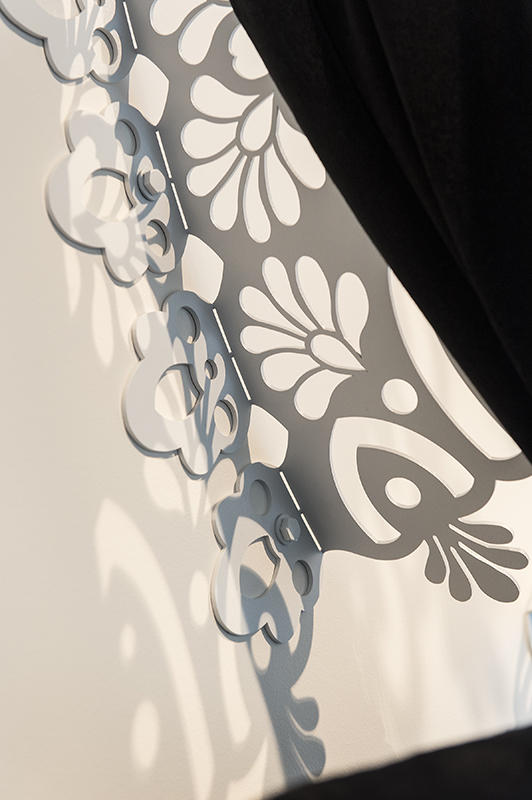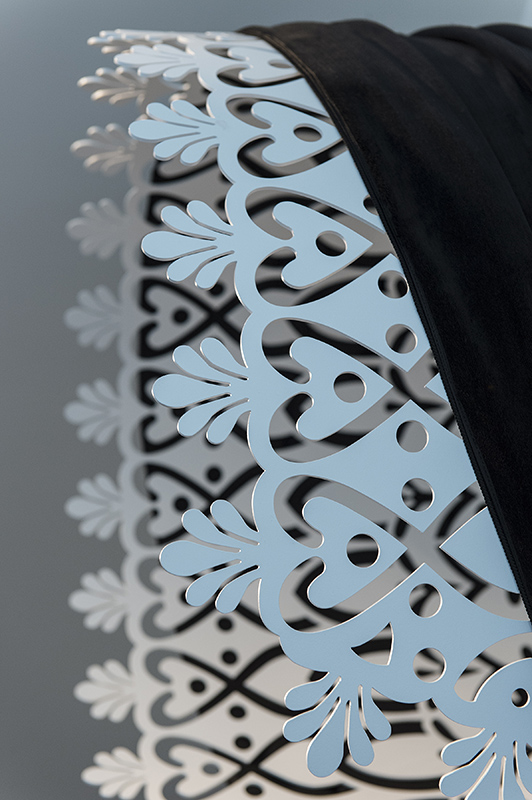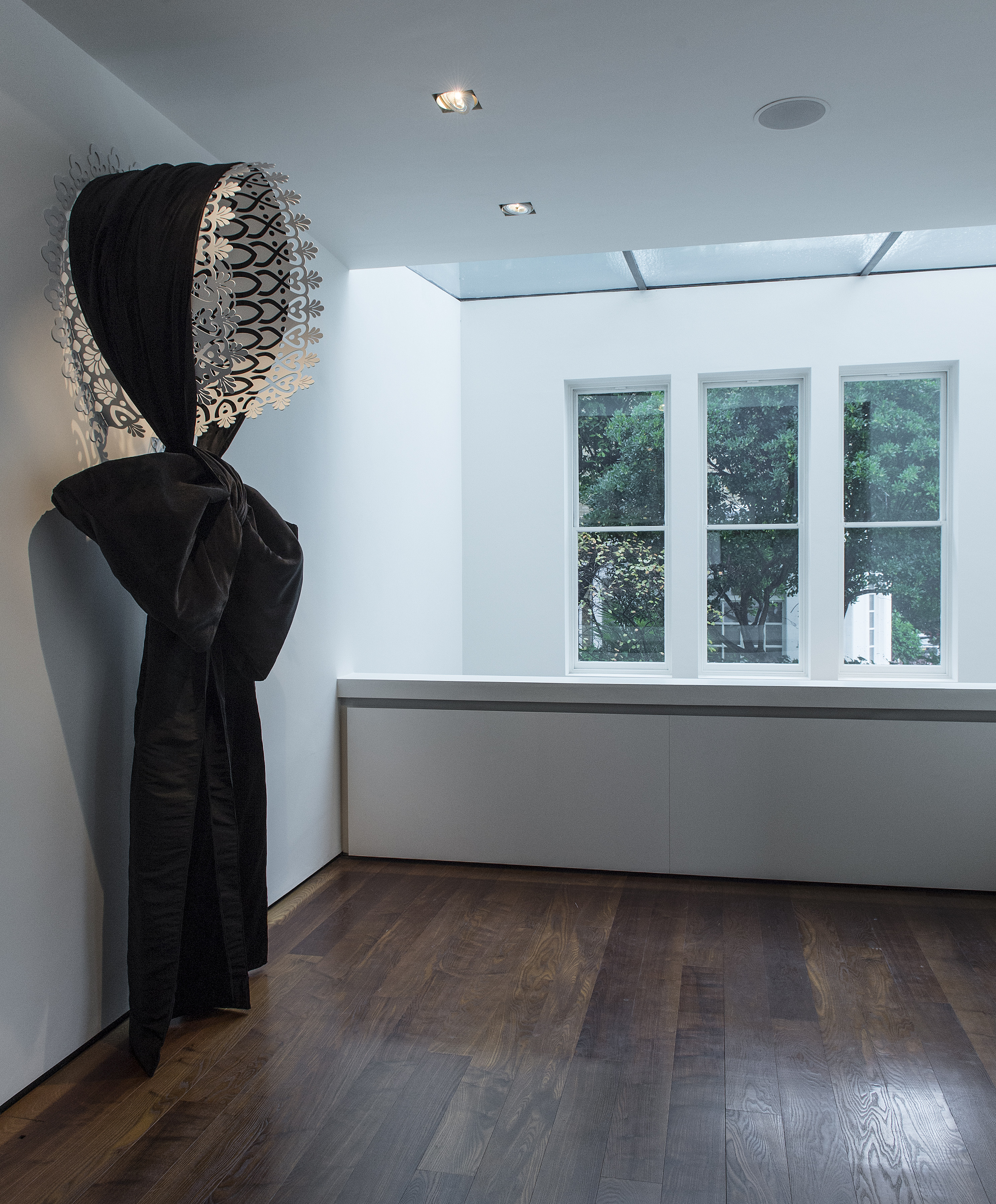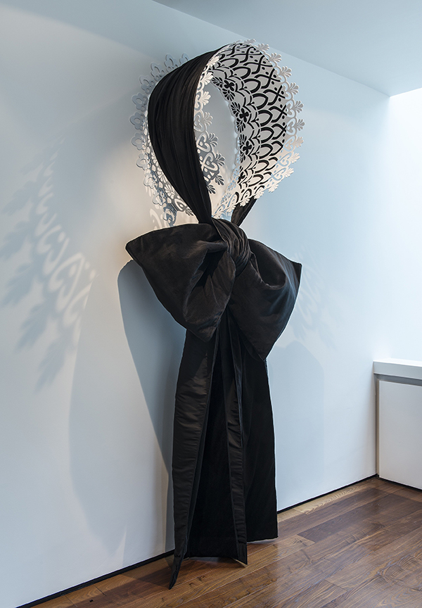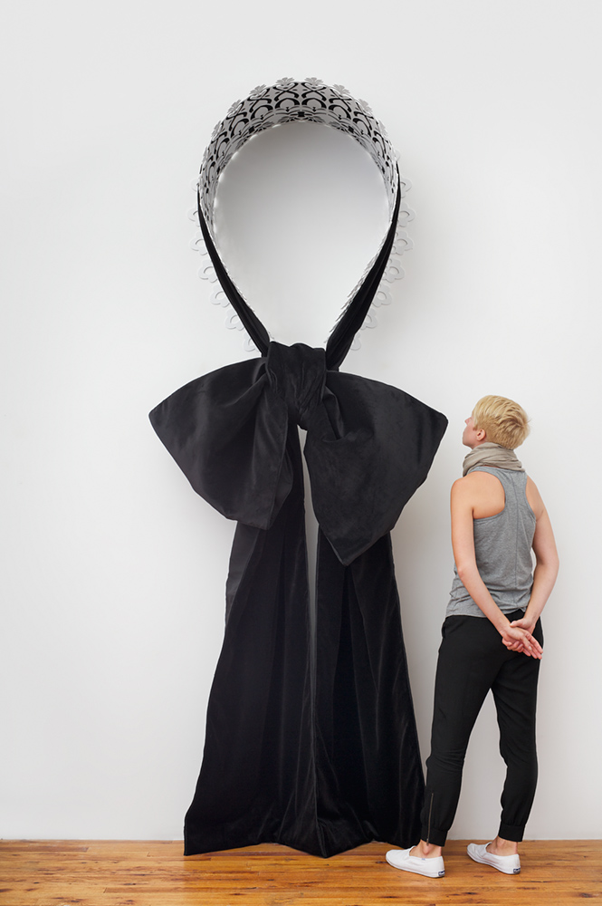 For Launch Pad, Foullon has chosen to shift her historical reference point to the Victorian heritage of the local neighbourhood, with Choker, a 9 1/2′ high painted steel and fabric bow. Drawing on her interest in clothing, and the collar in particular as an expressive signifier of the self, the black velvet bow is presented as both fashion accessory and symbol of the strictness and austerity of its time. Its heroic scale makes a monument of the object, giving a timeless dimension to an item with a particular history and resonance in the collective English memory.