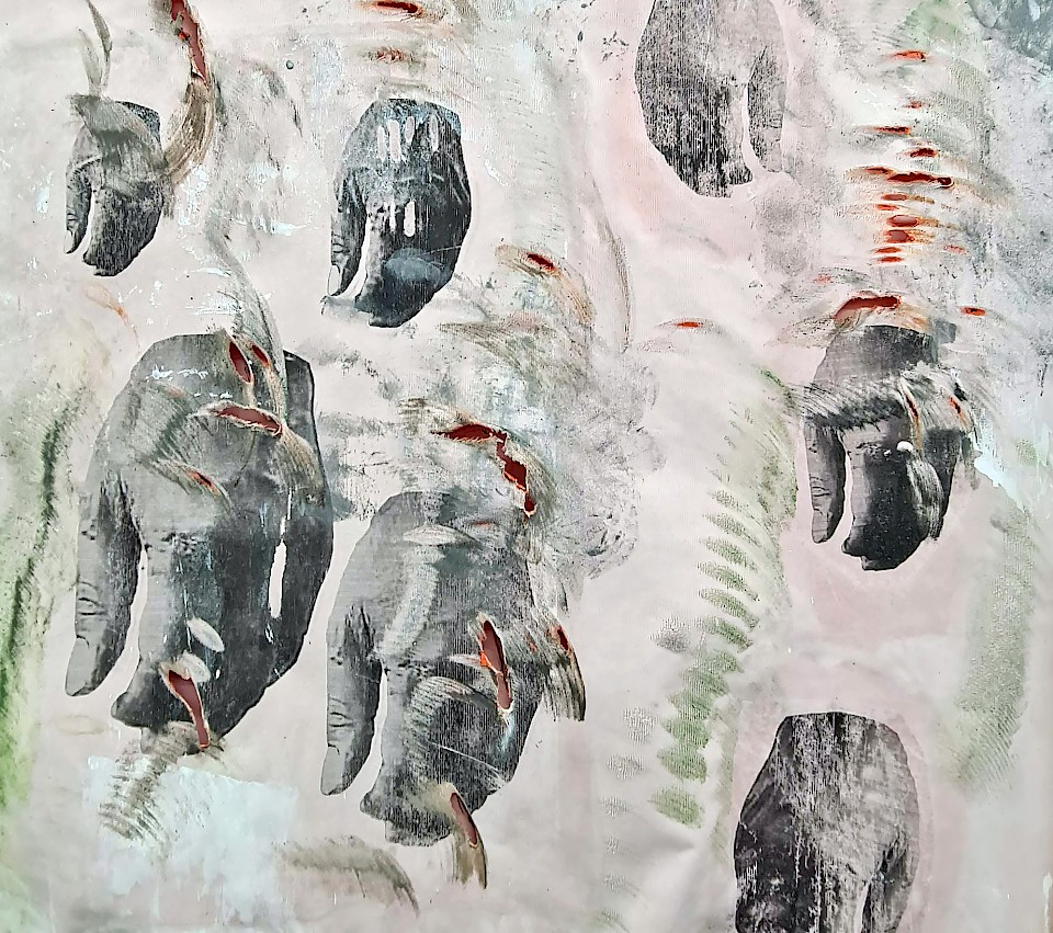Tent, 2022, mixed fabrics, acrylic paint, image transfer, wood, steel, dimensions variable. Detail.