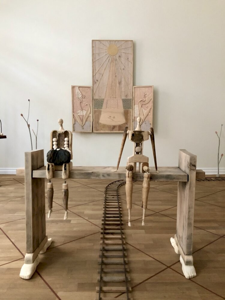 Henning Hamilton and Linda Pedersen will present their first joint exhibition at Arsenalsgatan 3. The artist-duo have let their beings and creations take over the gallery and we are permitted to step right into their world. It vibrates with life while at the same time, time stands completely still. Lanky flowers gracefully sculpted in wood track their way heavenwards and a train appears to rush across the gallery floor; while the scale, which has almost taken human form, becomes a symbol of the dissonance in the world we live in. Over all this there watches the buttercup, which both sees and lights up, gives life and governs. Hamilton and Pedersen have created a rich and fantasy-filled menagerie, charged with both history, the present and the future. Dream is entwined with reality and the sensitive forming of the wood sculptures, sprung from elm, oak, lime and fir, exist side-by-side with the mechanical and more playfully constructed objects. Hamilton and Pedersen have brought children’s intuitive play into the world of the grown-ups and everything is of the greatest seriousness.