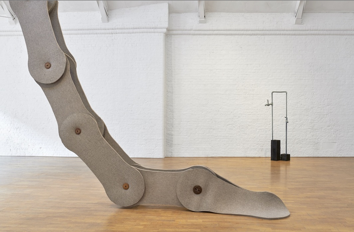 Johanna Unzueta’s speech, lilting and melodic, is peppered with one of art’s most taboo words: beautiful. And yet it suits to a tee her capacious and interdisciplinary practice, one that transmutes—through delicate material sleights—the ordinary into the surprising, and by turns dazzling. A huge chain, made from thick cuts of gray felt, unfurls from the ceiling, each oversized link fragile yet tough, warped just slightly at the edges; a set of pale ochre and blue-striped uniforms hang mutely on a clothing rack; wall drawings in charcoal and bronze dip in and out of corners, ladder up and down walls, glinting in the light. Craft, intuition, and collective histories and methods are deeply embedded in the deceptively modest, pared down language of Unzueta’s art. In the midst of shows in Munich, Oxford, and Edinburgh, she discusses her work.
