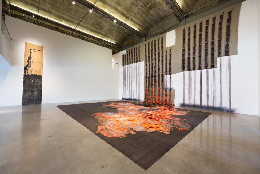 Me At Market, Visual Arts Center, University of Texas, Austin. 2020. A multi-part installation comprising a large linen textile and two works on paper. Mixed media including dyes made from cochineal and lemon juice. Installation view. Image: Courtesy the Artist and Commonwealth and Council, Los Angeles.