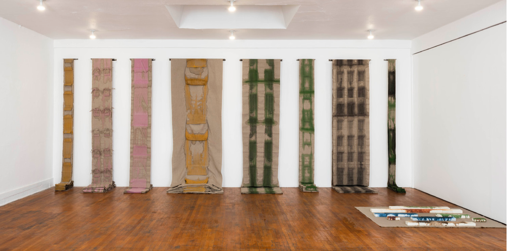 With site-responsive interventions, Argote addresses the architecture of her surroundings, disrupting the boundar- ies between inside and outside, public and private. A grid of pockets sewn onto bolts of linen resembles skyscrapers or apartment blocks. Chance and deliberation coincide in Argote’s materials, whether through stains or splashes. Cochineal, a pigment derived from insects found on cactus throughout North and South America, is mixed with lemon juice and doused over paper or dripped on linen. This autonomy of engagement exceeds these materials’ commodity status yet still recalls histories of labor, consumption, and colonialism.