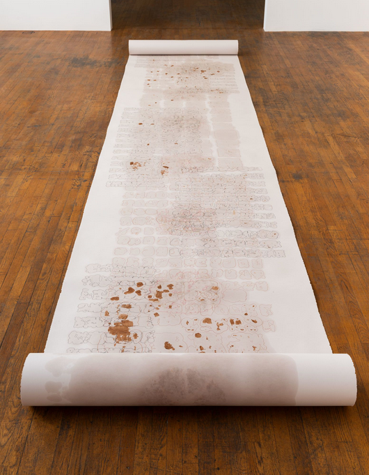 Digesting Scroll—Feb, March, April, 2020. Protein bar oil transfer, chocolate, and crayon on paper. 50 x 264ins (127 x 671cm)