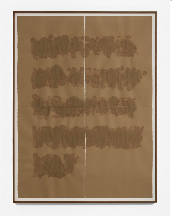 The remnants of Argote’s actions—pouring liquids through fabric pockets or swiping her hands and body over puddles of dye and lemon juice—ensure that the artist’s body and labor become implicated in the work.