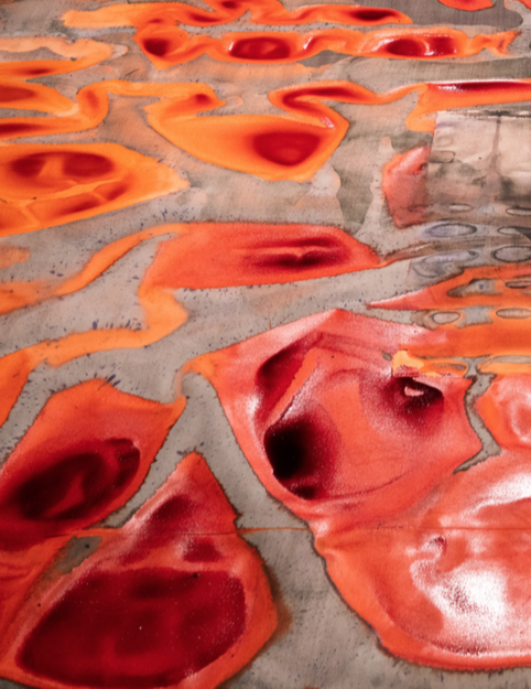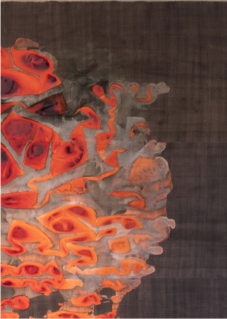 Cut—Right of Courtyard (Me at Market), 2020. Cochineal and lemon on Arches oil paper, 116.25 x 72.25ins (295 x 184cm).