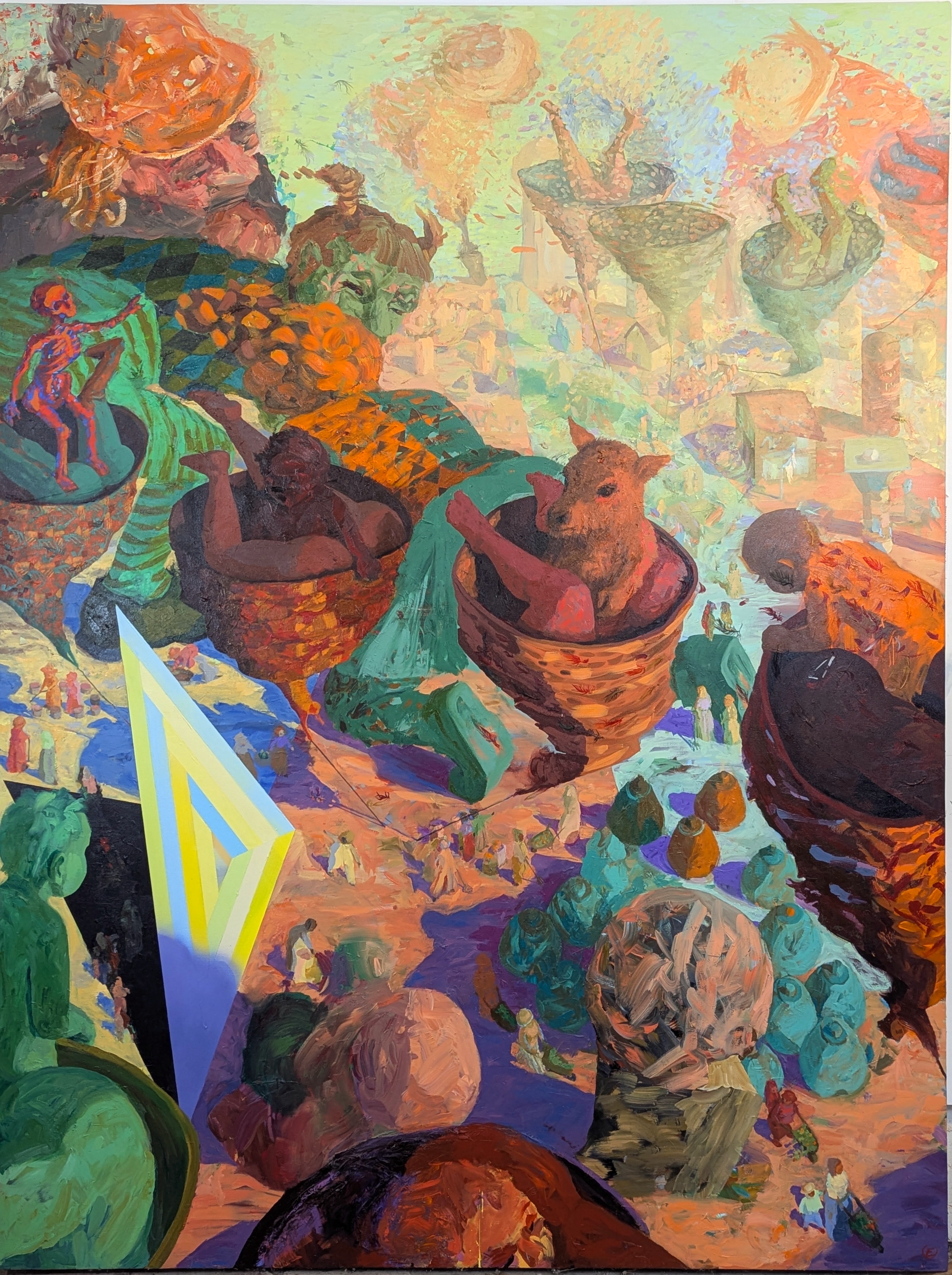 Her paintings, conversely, unfold as dissonant psychoscapes where figuration drifts through dreamlike fields of colour, staging the instability of emotion, memory, and narrative.