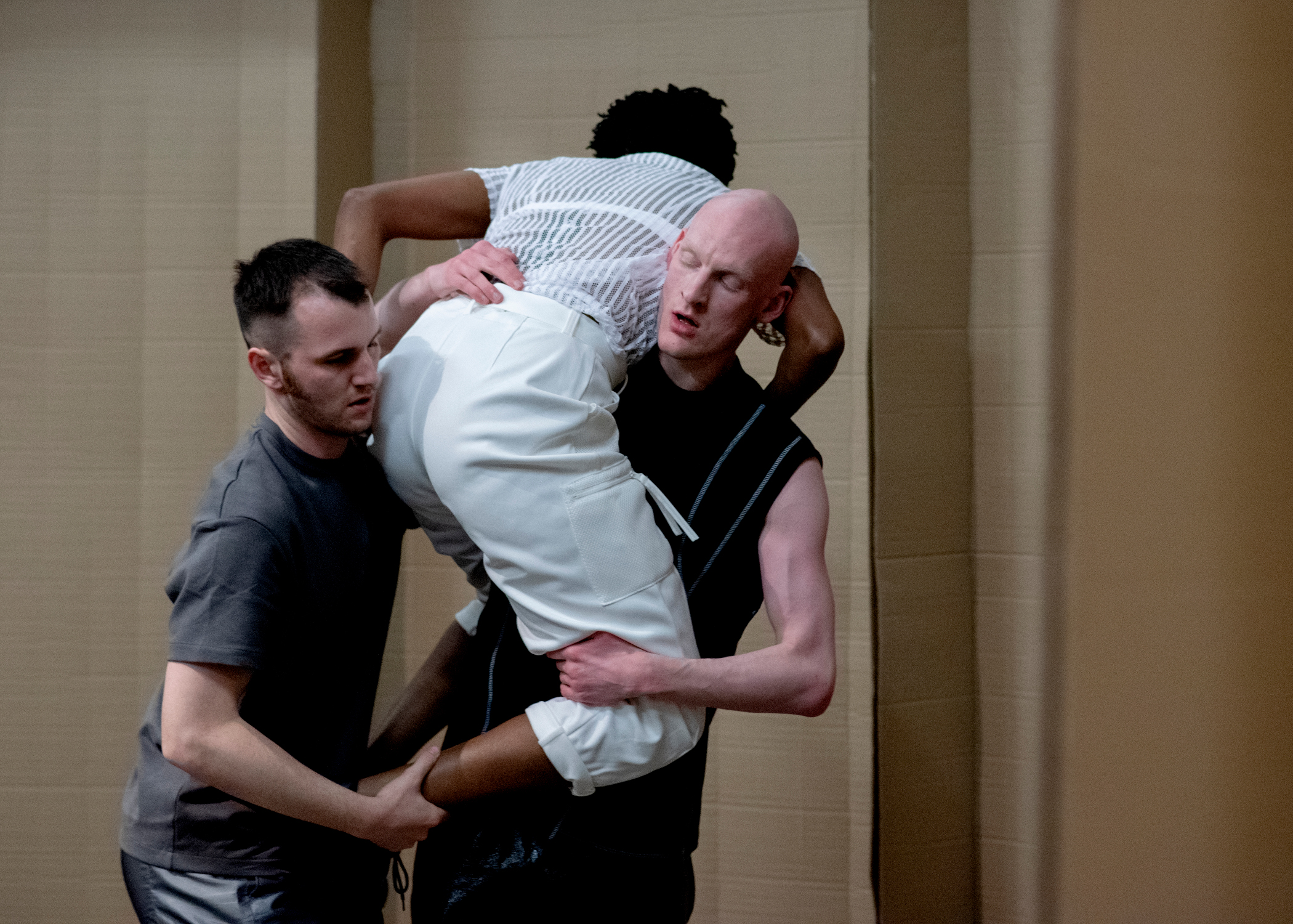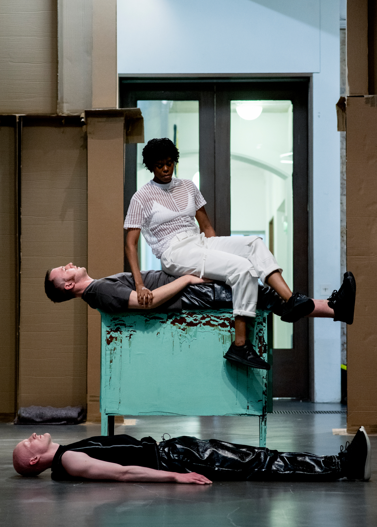 Materiality Will Be Rethought, 2020 by Joe Moran presented in the exhibition Something Necessary and Useful by Carlos Bunga. Commissioned by Whitechapel Gallery and produced by Dance Art Foundation. Dancers: Temitope Ajose-Cutting, Thomas Heyes and Sean Murray. Photography: Camilla Greenwell.