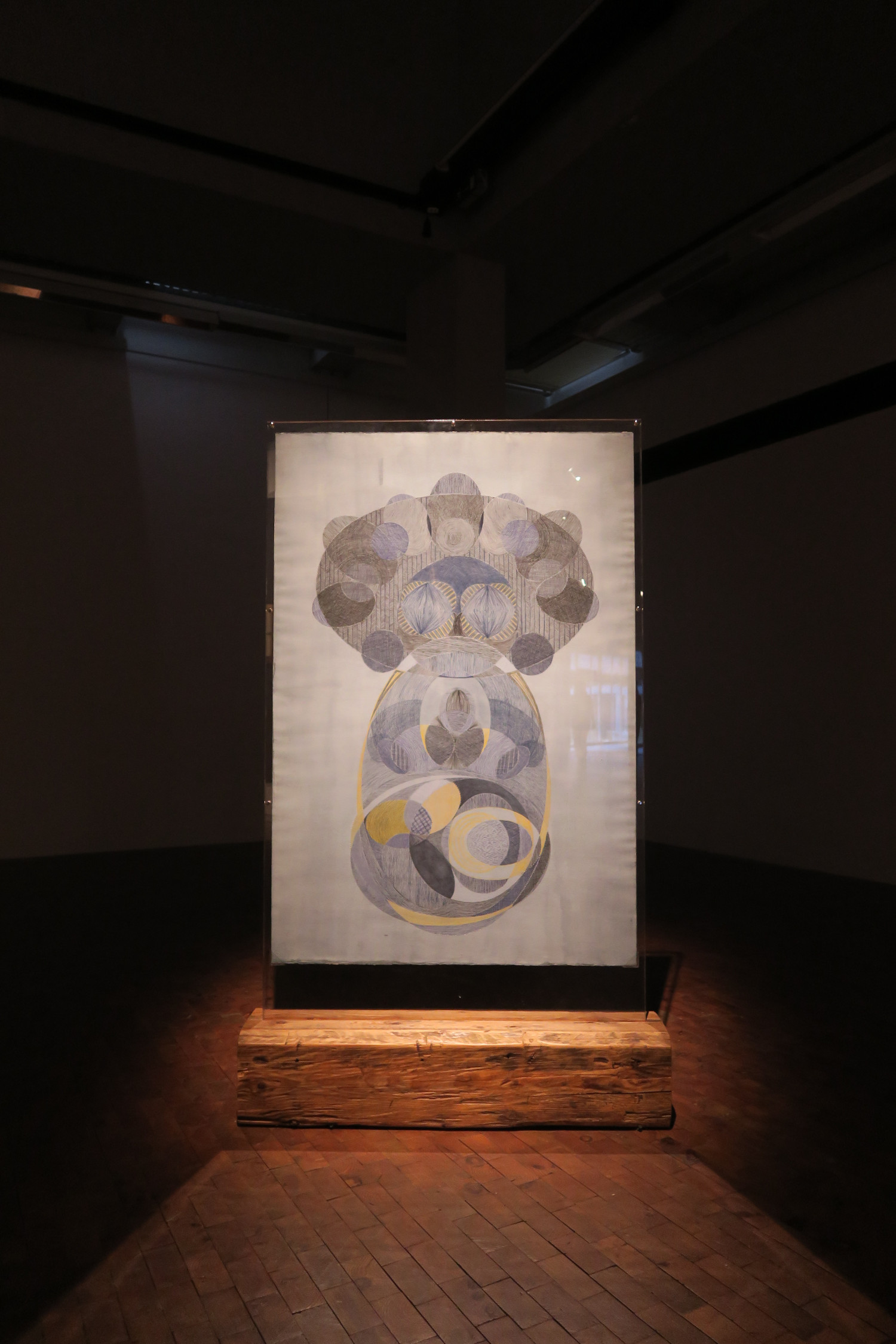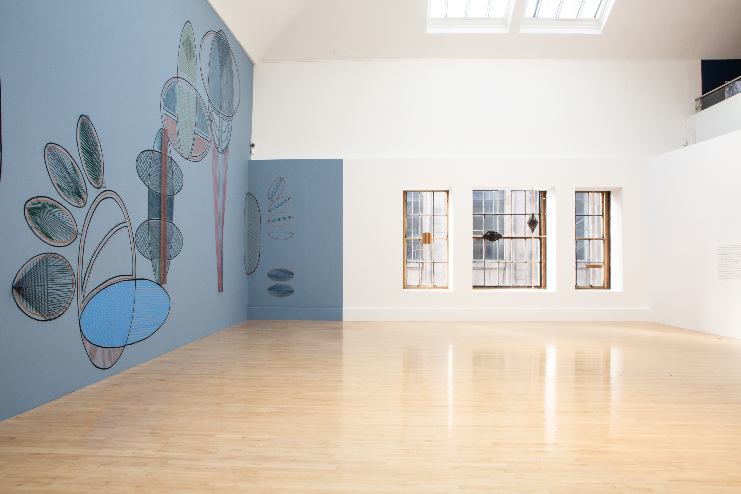 Pine's Eye, Talbot Rice Gallery, University of Edinburgh, UK. Mural piece 1:1 Resonance and 3 sculpture pieces, 2020. Installation view. Image: Courtesy the Artist