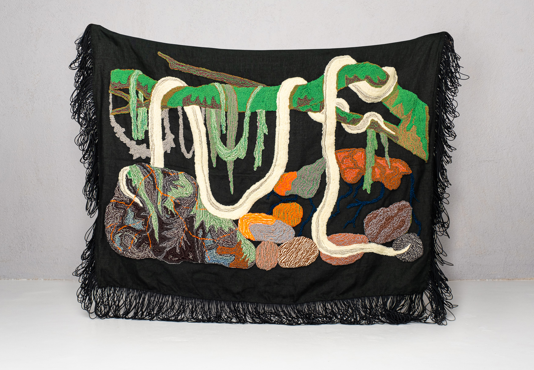 Laura Põld, The leaves moved and you faded into the pattern of grass and shadows, and I returned smiling and haunted, to a dark morning, 2022. wool, burlap, rope. Photography: Albert Kerstna.