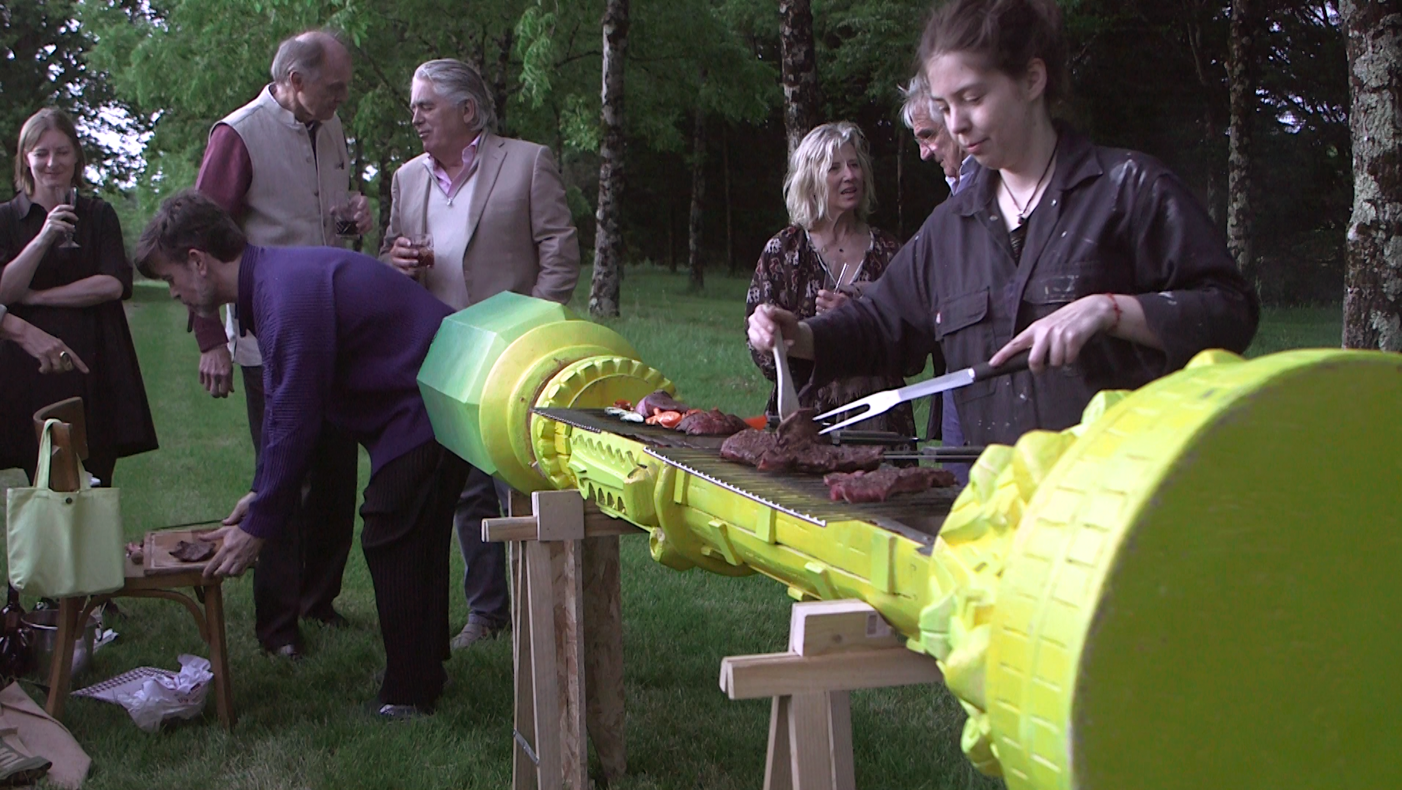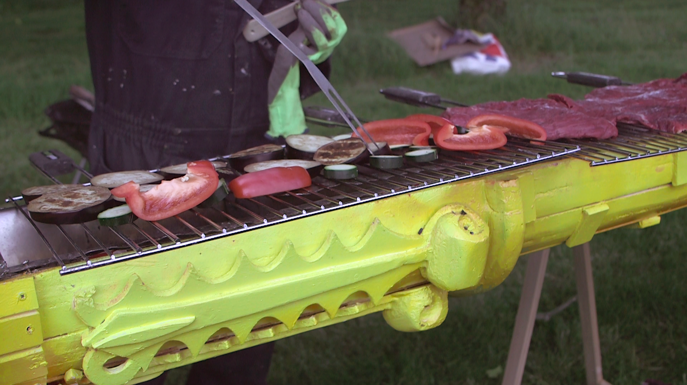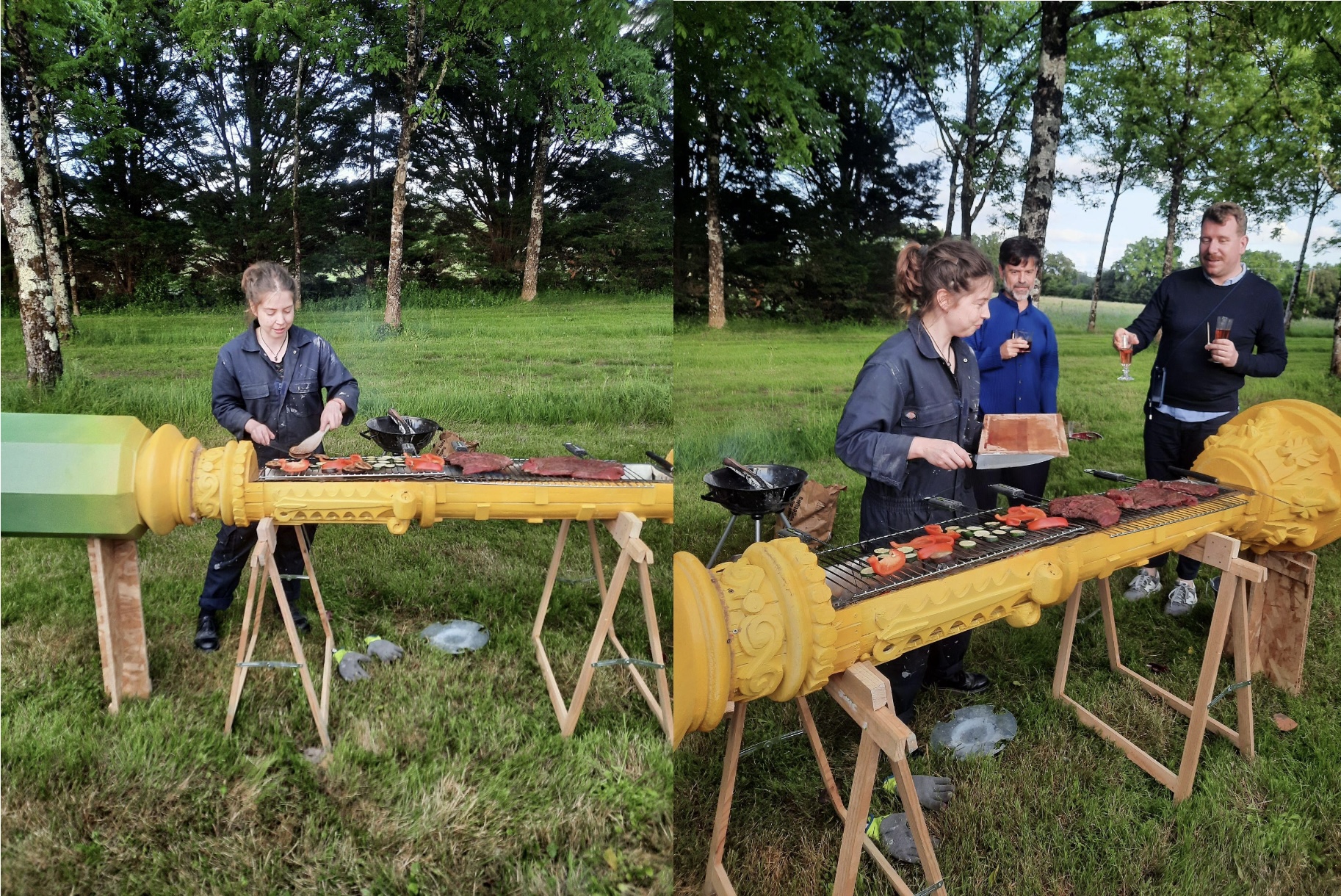 Throughout the residency, Pilar was considering the question “What do we do with the knowledge that we have?” She uses the knowledge brought by Prometheus to bring people together. On the last Saturday of the residency, she invited a group of us staying at the estate to join her for a barbecue. When we arrived at the designated strip of land, near a shaded canopy of trees, we found Pilar in her navy blue, paint-splattered boiler suit, tongs in hand. In front of her, Ferula Communis was laid across two wooden supports, its belly opened up to reveal a barbecue grill over hot charcoal. Vegetables and meat had already started to char. Her artwork created the centrepoint of a temporary community brought together by the residency, gathering around hot food, the smoky scent of the barbecue and the freedom of being out in the countryside. The Latin word communis means common or shared. Here, Pilar had created a moment to share knowledge and create different ways of interacting, a new setting for conversations and laughter away from the formal dining table.