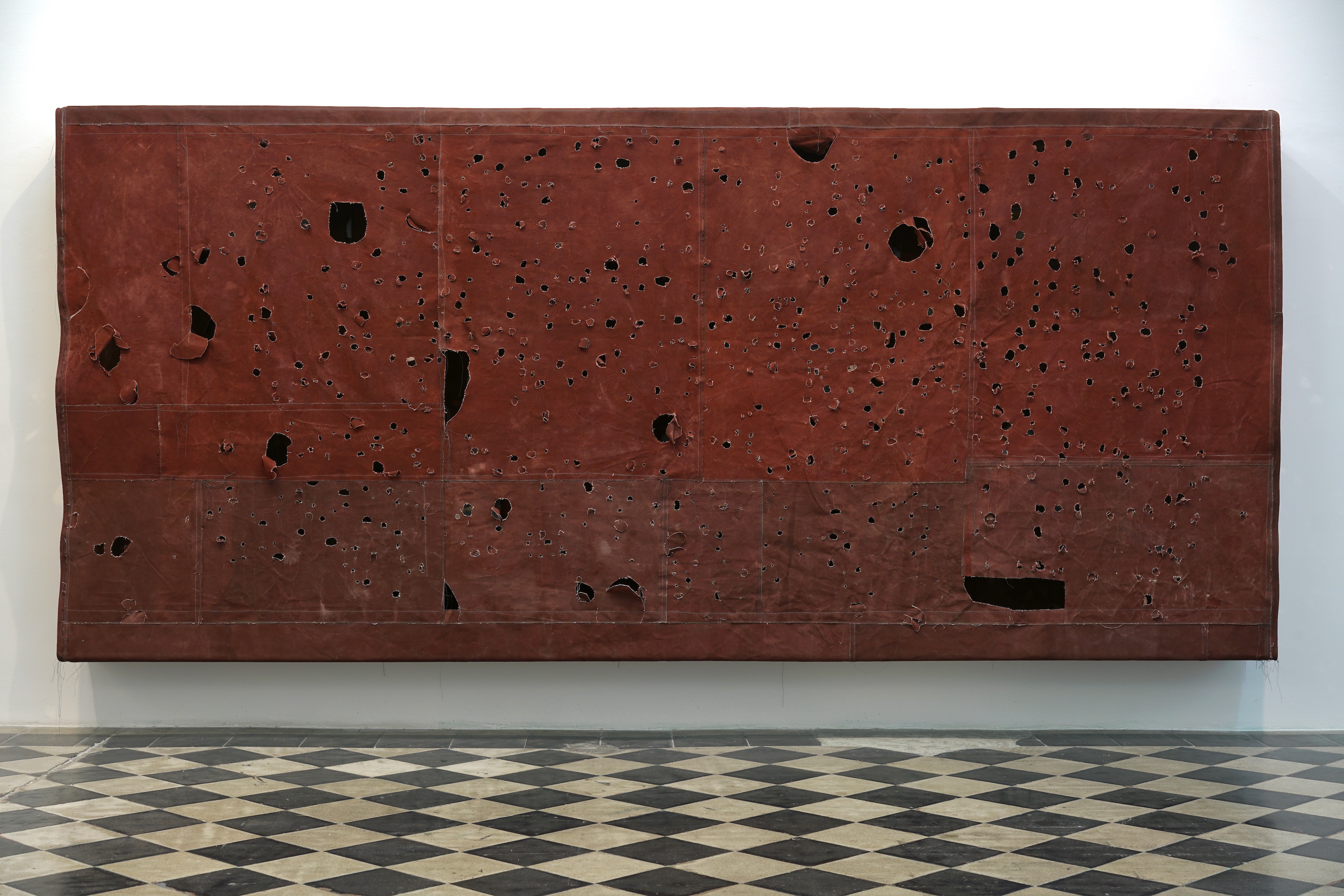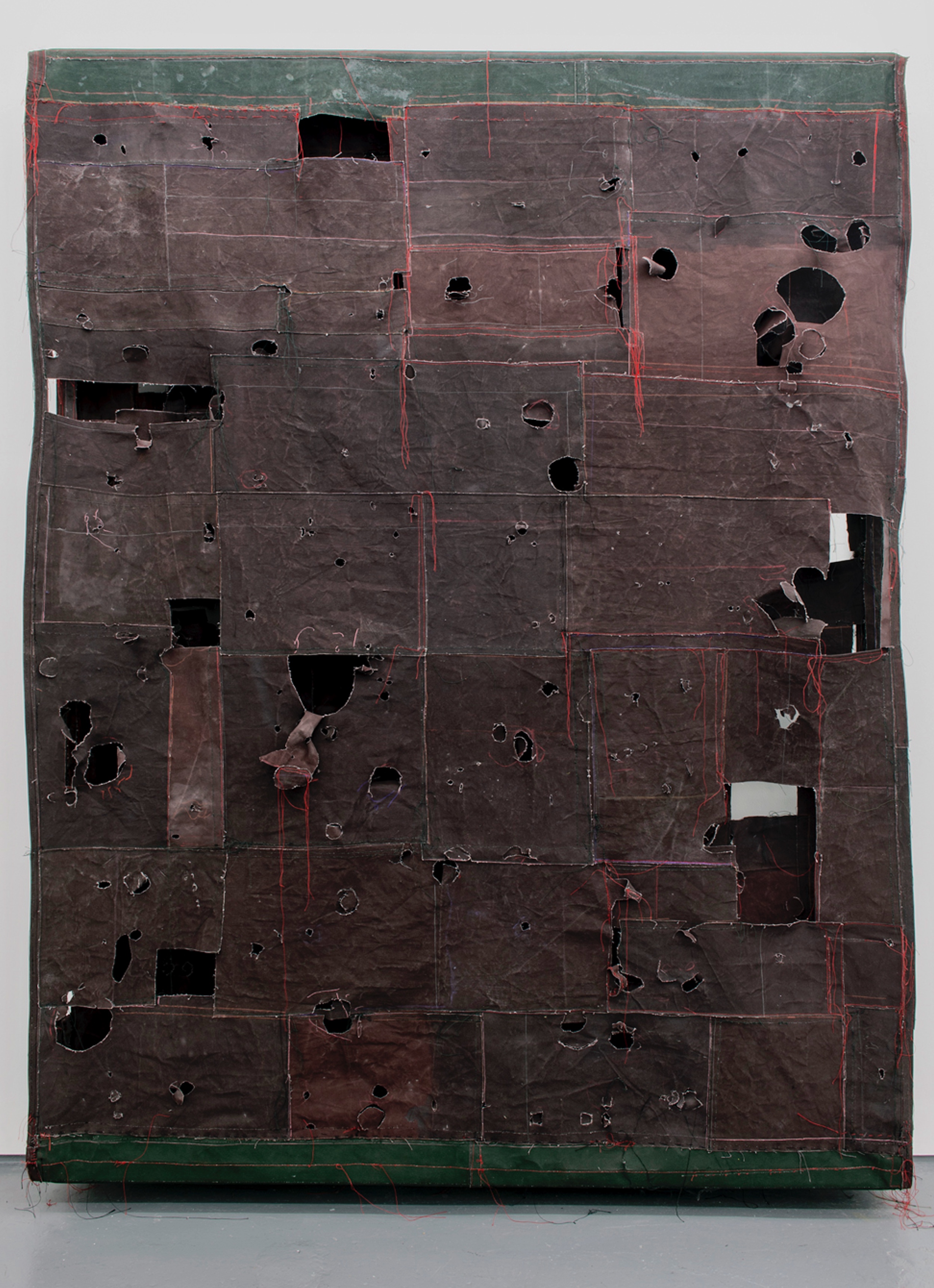 Flat Painting Bofari 15 Caput Mortuum, 2015. Canvas, distemper, thread, pencil, wood, and aluminium, 237 x 178 x 26 cm. Image: © Simon Callery. All Rights Reserved, DACS/Artimage 2021, Courtesy; Fold Gallery, London. Private collection Madrid.