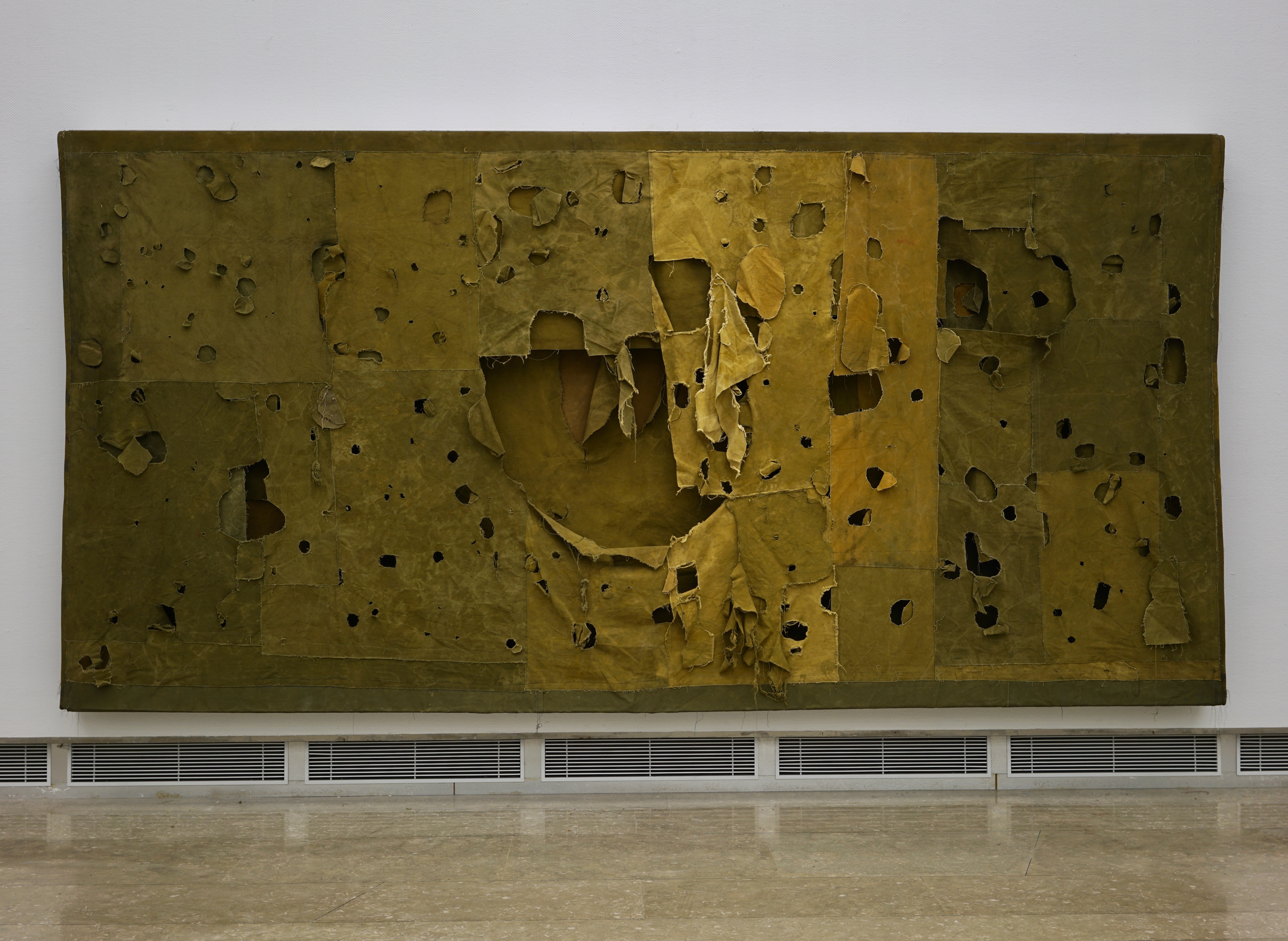 Country Register, 2018, Canvas, distemper, thread, wood, aluminium rail and steel bolts, 250 x 503 x 22 cm. Image: © Simon Callery. All Rights Reserved, DACS/Artimage 2021.