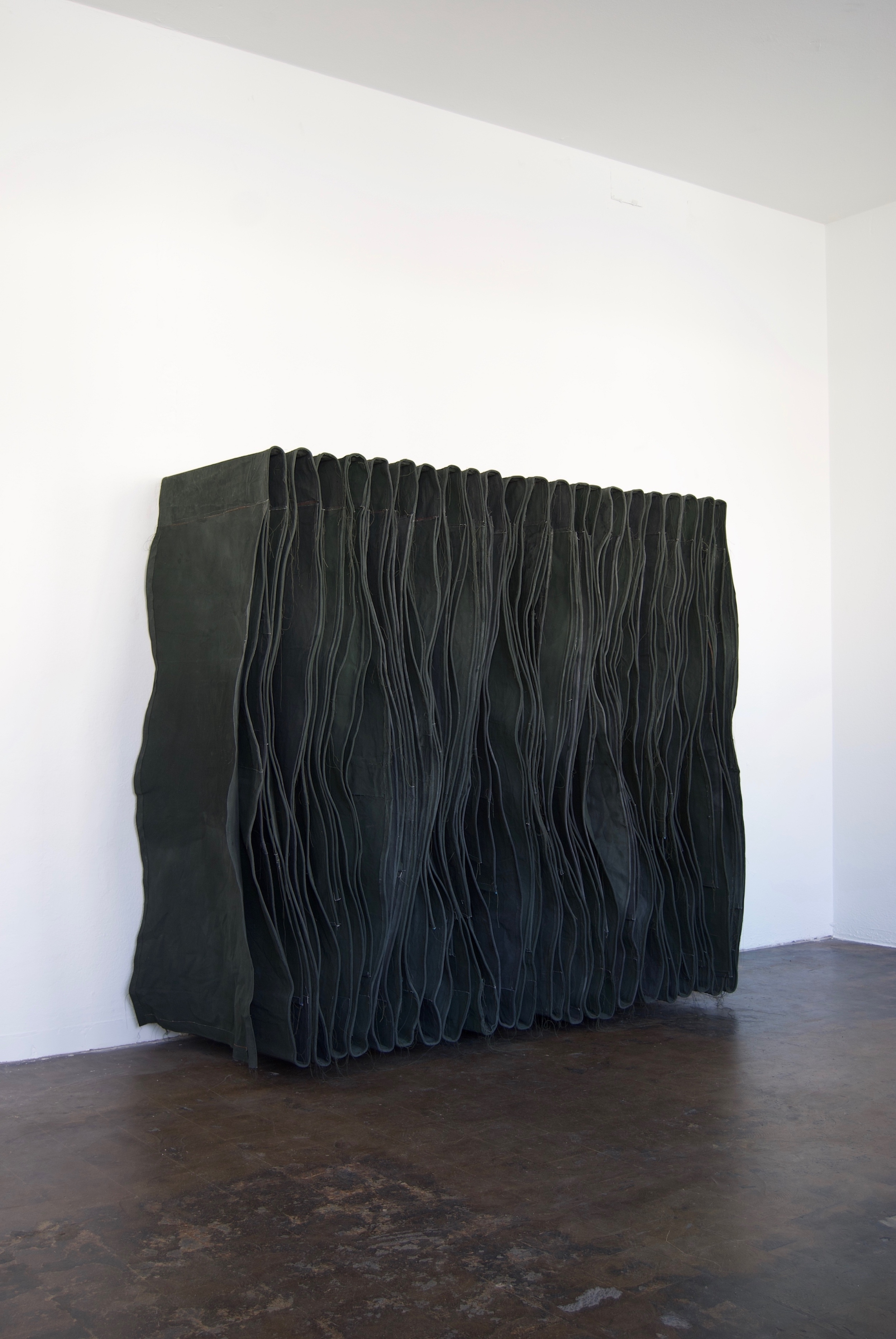 Wallspine (Leaf), 2015, Canvas, distemper, thread, aluminium and steel brackets, 206 x 236 x 84 cm. Image: © Simon Callery. All Rights Reserved, DACS/Artimage, 2021.Courtesy; Annex14, Zurich.