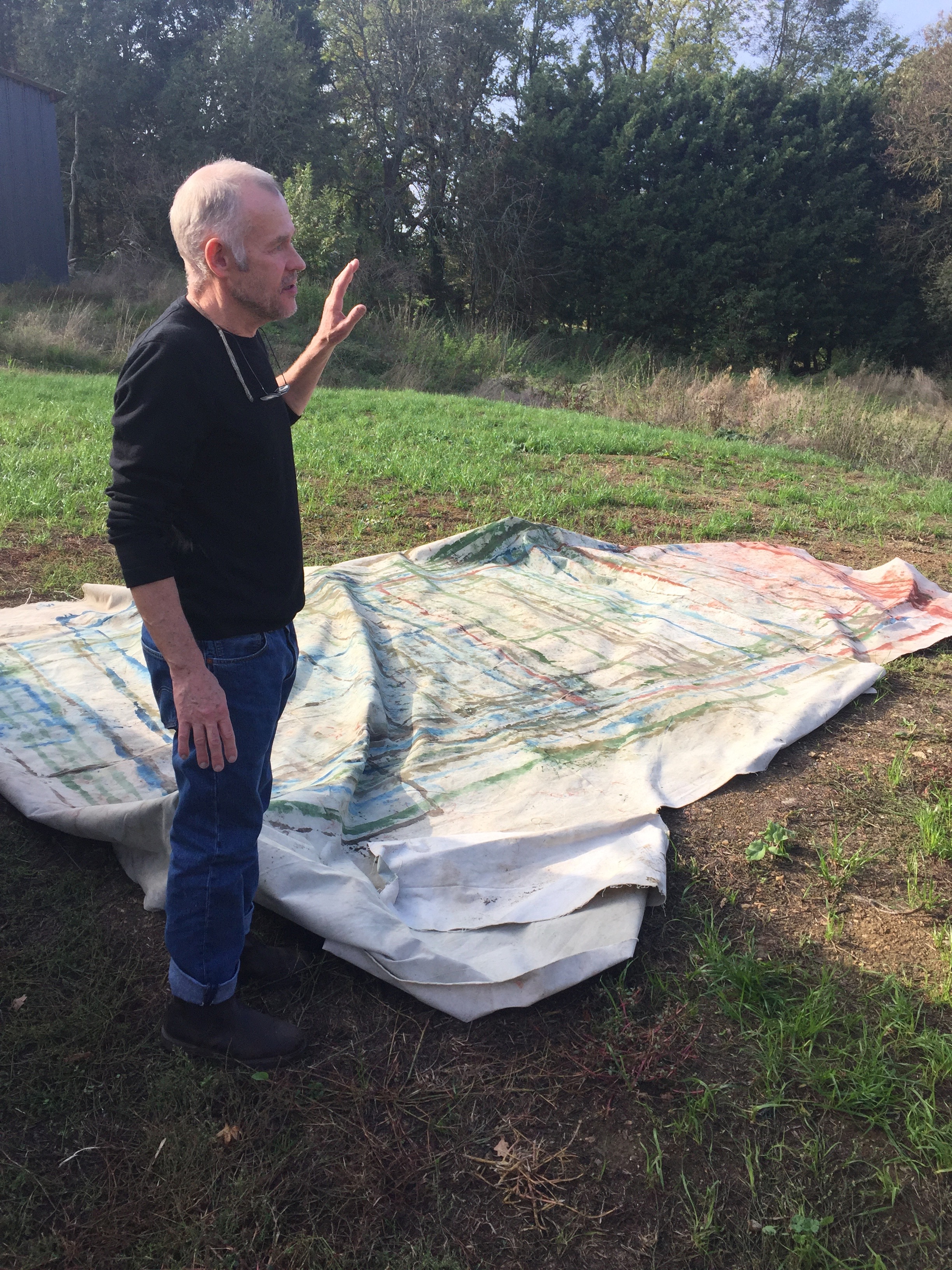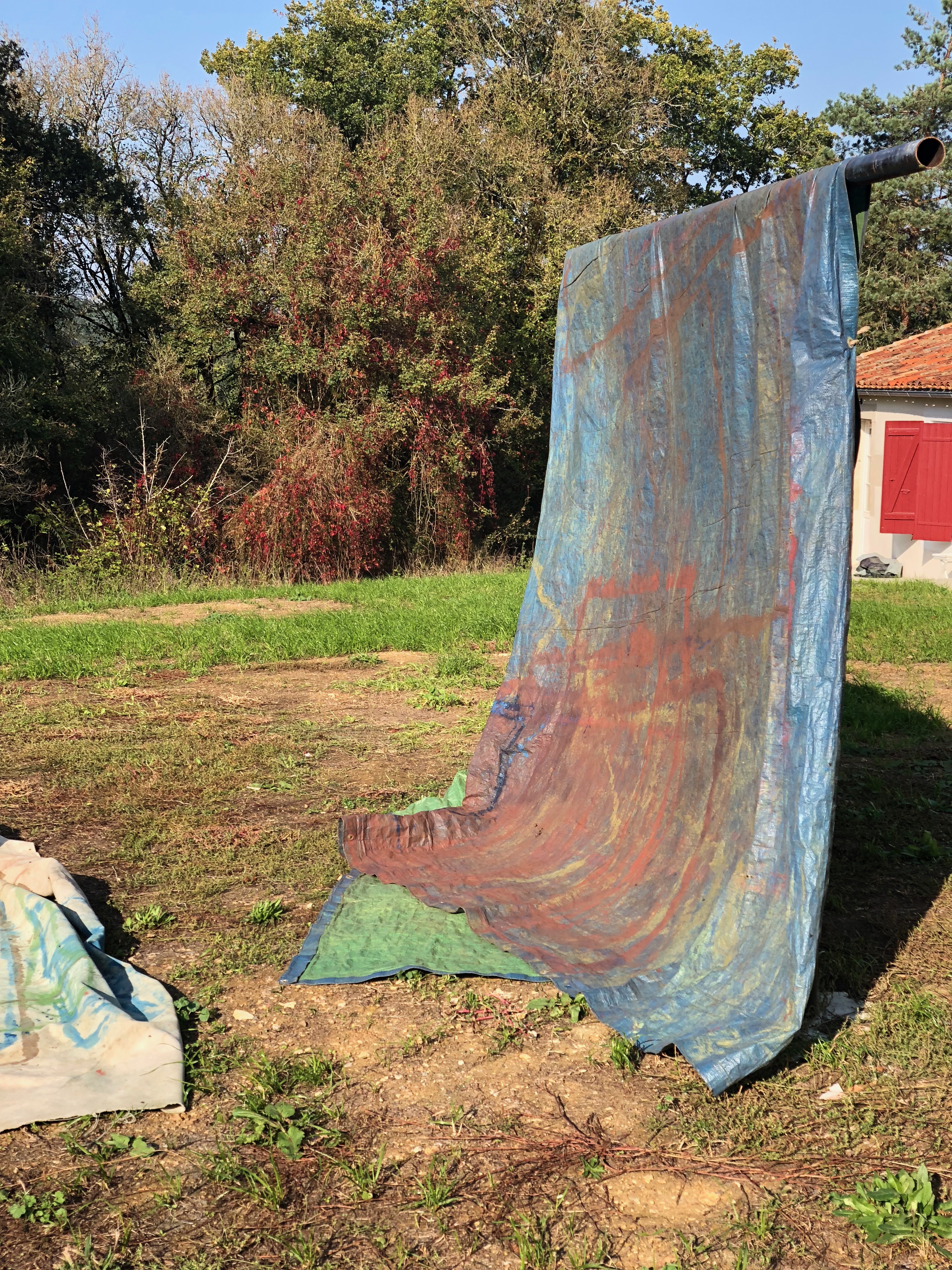 I brought 50 metres of canvas, 20 kilos of pigment and two 5-kilo bags of rabbit skin size with me to La Boissiere. I wanted to make paintings whose colour and form derive from physical contact with the landscape.
