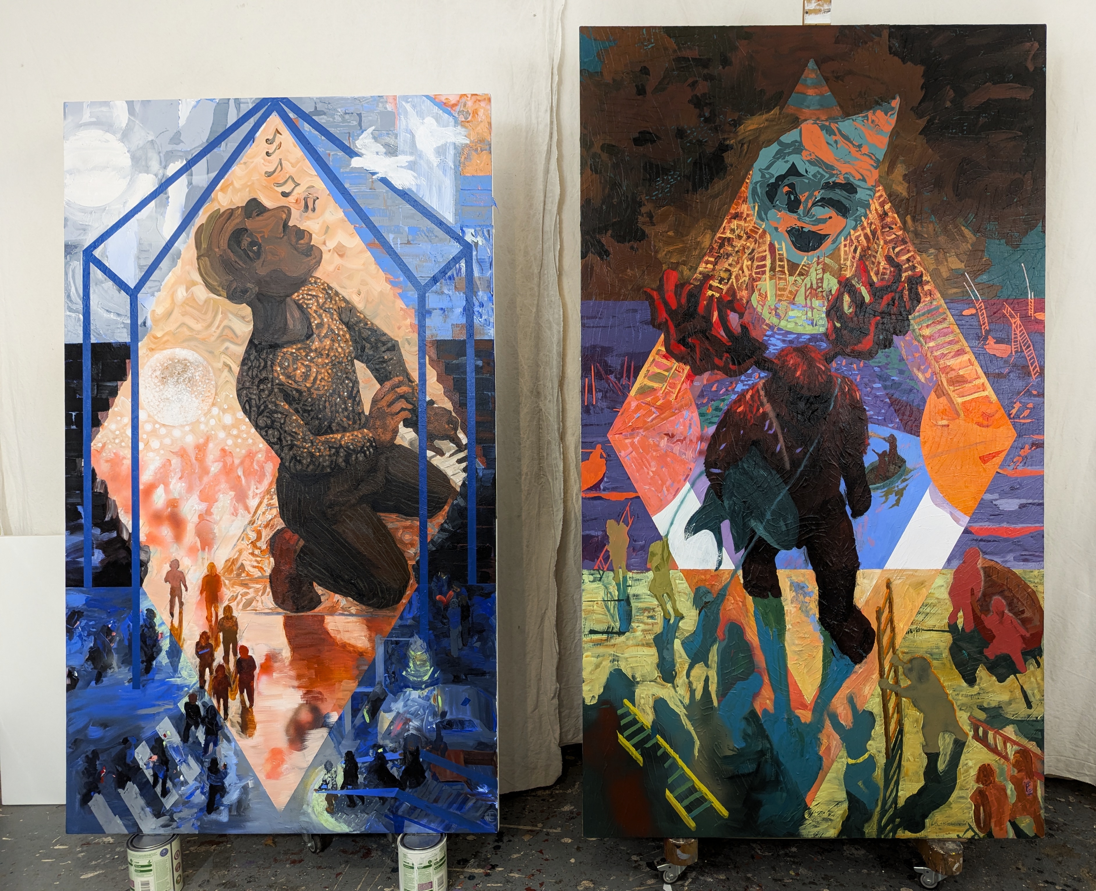 Elizabeth Chisholm, Proximity to the Young Whistler, 2025. Acrylic on canvas, 180 x 100cm. Proximity To The Man And The Moon, 2021. Acrylic on canvas, 180cm x 100cm.