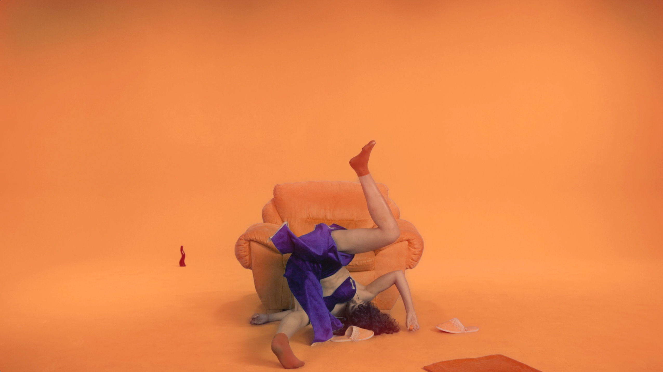 Sitting with Valentyna is entering another cosmos. Her temporary studio was already an ecosystem: fabrics destined for sculptural forms; a moodboard of reference images pulled from fashion editorials, film stills, and visual culture; fragments of dialogue and scenes for her developing script. Her work moves across installation, sculpture, performance, and film, driven by a persistent reconfiguration of domesticity, gendered labour, and the emotional architectures of interior spaces.